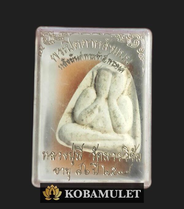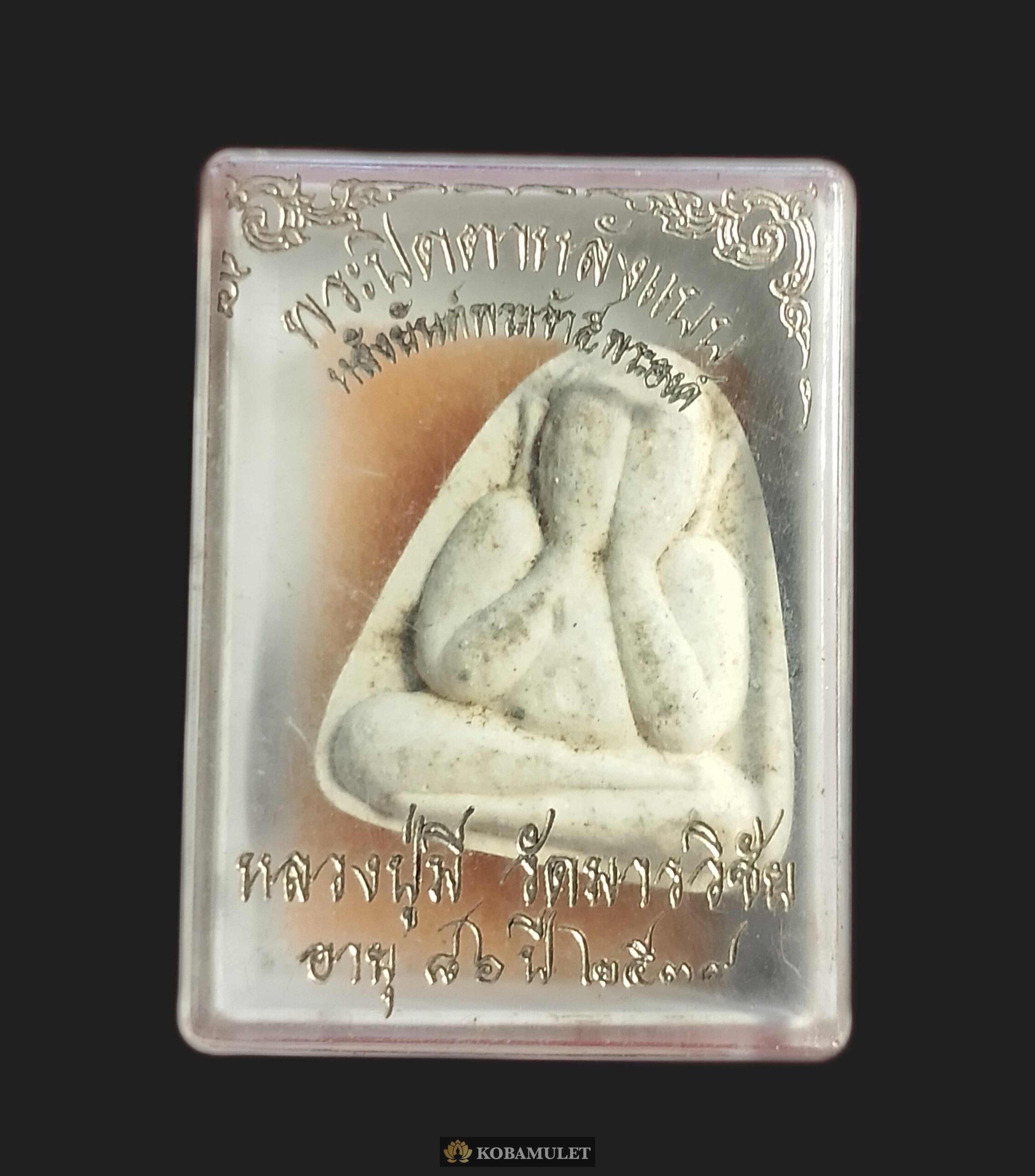 พระปิดตาหลังแบบ ตะกรุดเงิน หลวงปู่มี วัดมารวิชัย อยุธยา ด้านหลังบรรจุ พระคาถาหัวใจพระพุทธเจ้า 5 พระองค์ “นะโมพุทธายะ” ปลุกเสกพิธี รุ่นสุดยอดเบญจภาคี ปี 2539 สภาพสวยสมบูรณ์ ไม่ผ่านการใช้ พร้อมกล่องเดิมจากวัดครับ