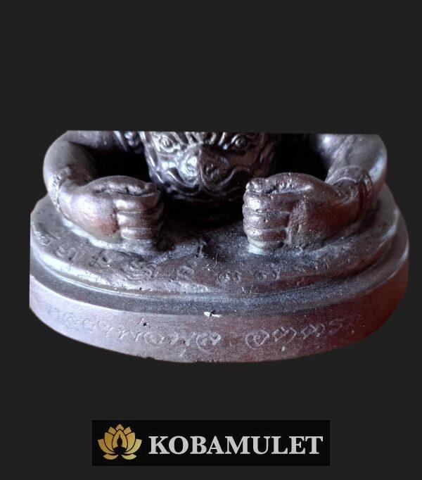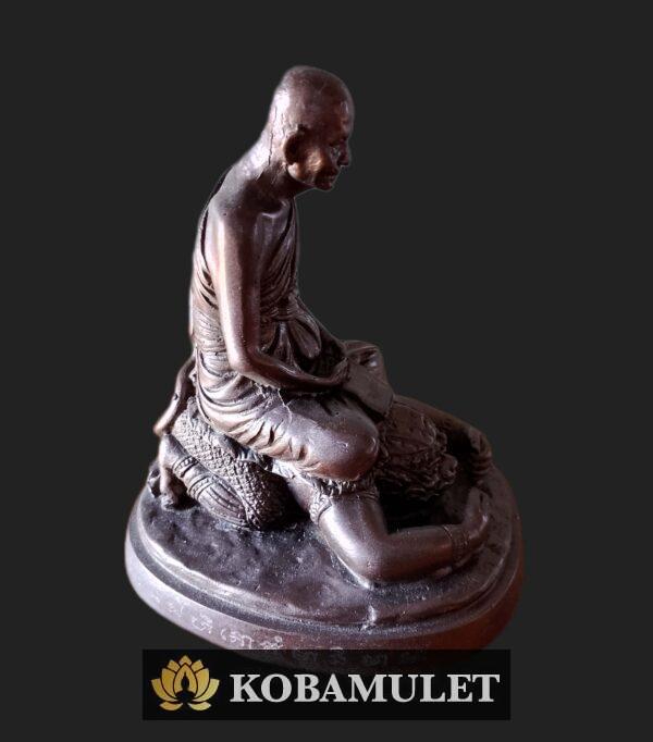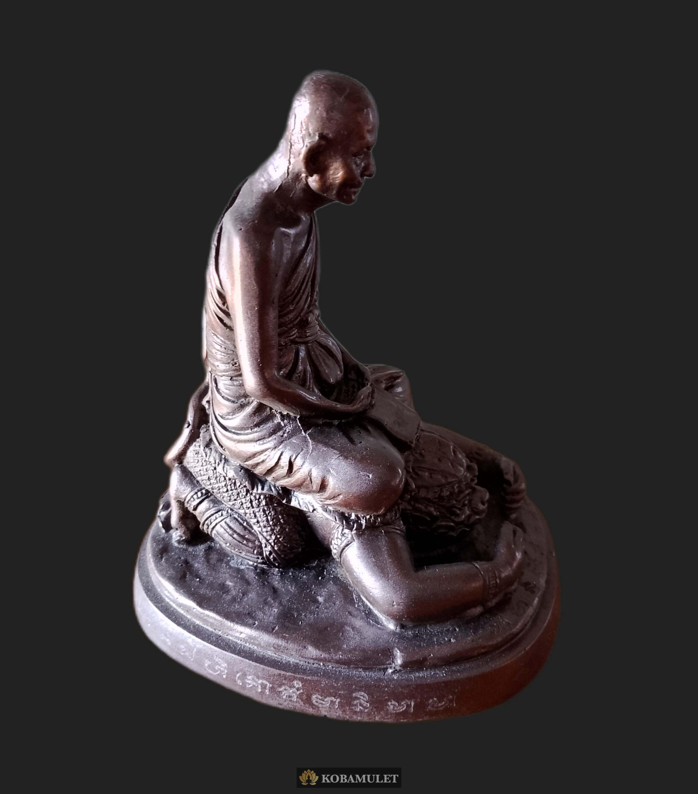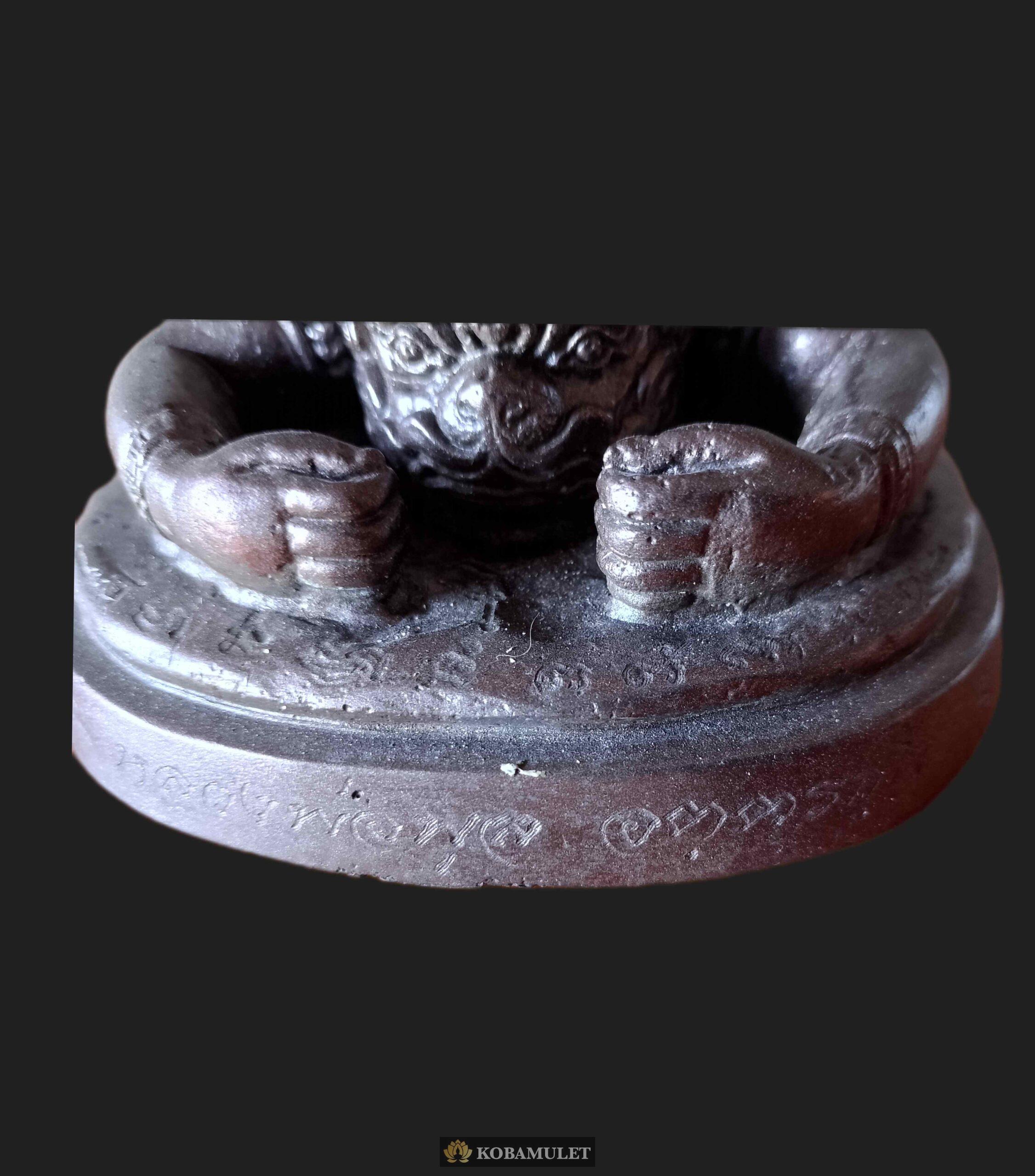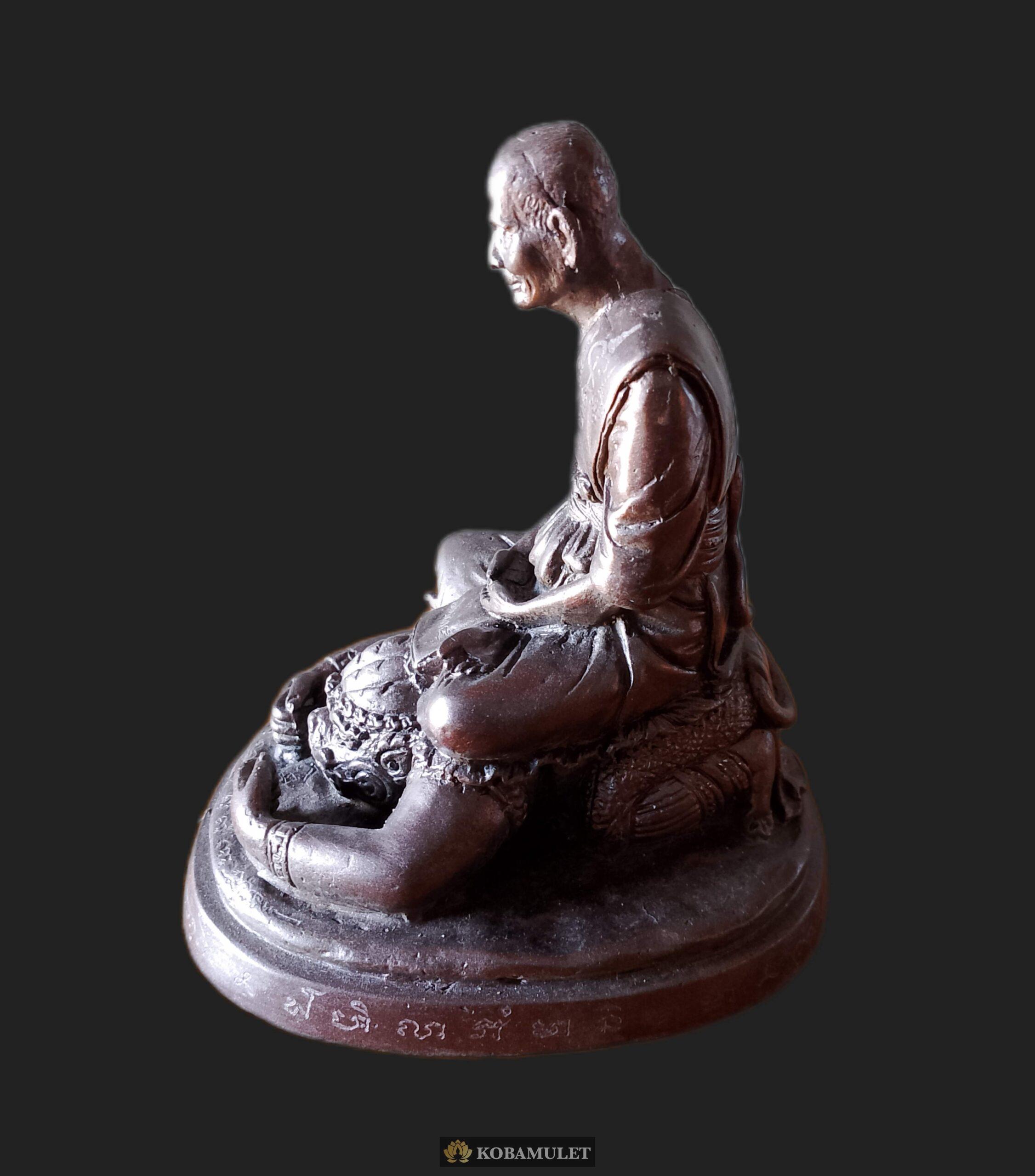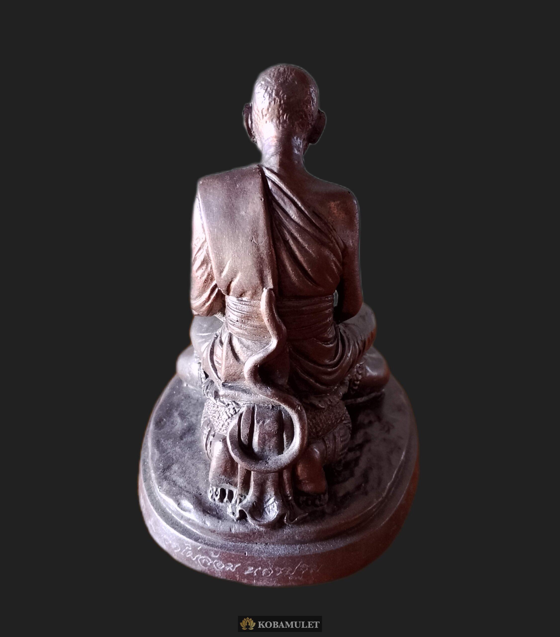 หนึ่งในวัตถุมงคลที่โดดเด่นนั้นคือรูปเหมือนของหลวงพ่อในขนาดบูชา ที่เทหล่อด้วยเนื้อโลหะผสมรมดำเคลือบผิว โดยหลวงพ่อท่านประทับนั่งสมาธิบนหลังหนุมานครองเมือง ปิดทองบางส่วน โดยซ้อนอยู่บนฐานหน้ากระดานทรงรูปไข่ โดยด้านบนและรอบฐานรวมถึงบริเวณสังฆาฏิจารึกอักขระยันต์ด้วยมือแบบจมลึกลงไปในพื้นผิว แลเข้มขลังยิ่งนัก