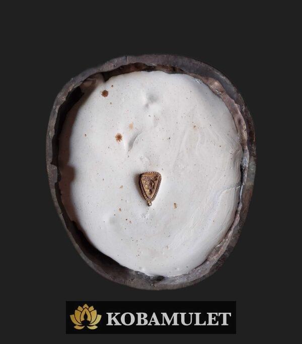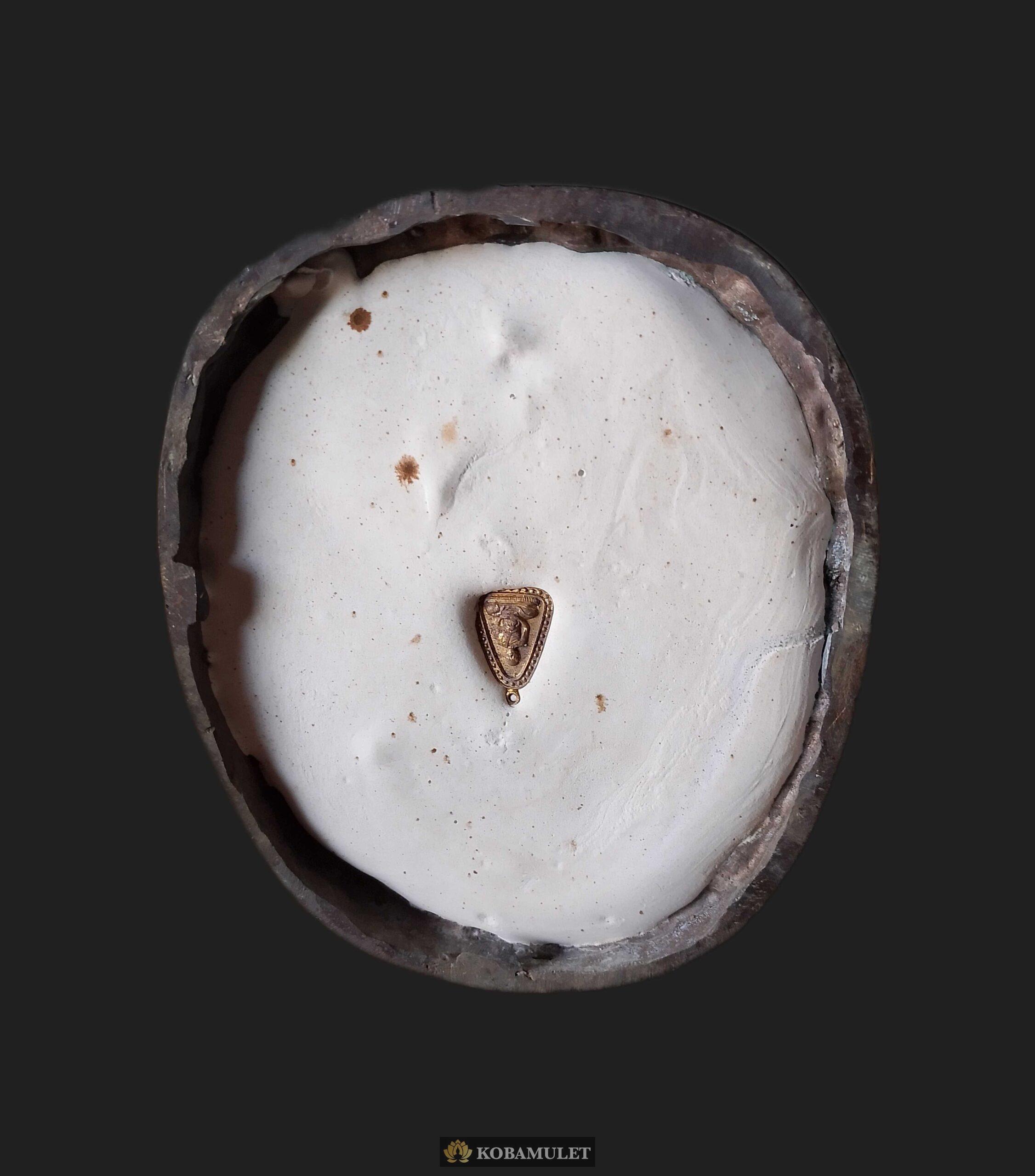 ใต้ฐานองค์พระบรรจุ “เหรียญรูปทรงจอบมีเม็ดไข่ปลาโดยรอบ ของหลวงพ่อพูล เนื้อทองเหลือง” โอบล้อมด้วยปูนพลาสเตอร์แห้ง แน่น แข็ง แกร่ง สมอายุปูนที่ผ่านกาลเวลามาเนิ่นนานถึง 14 ปี