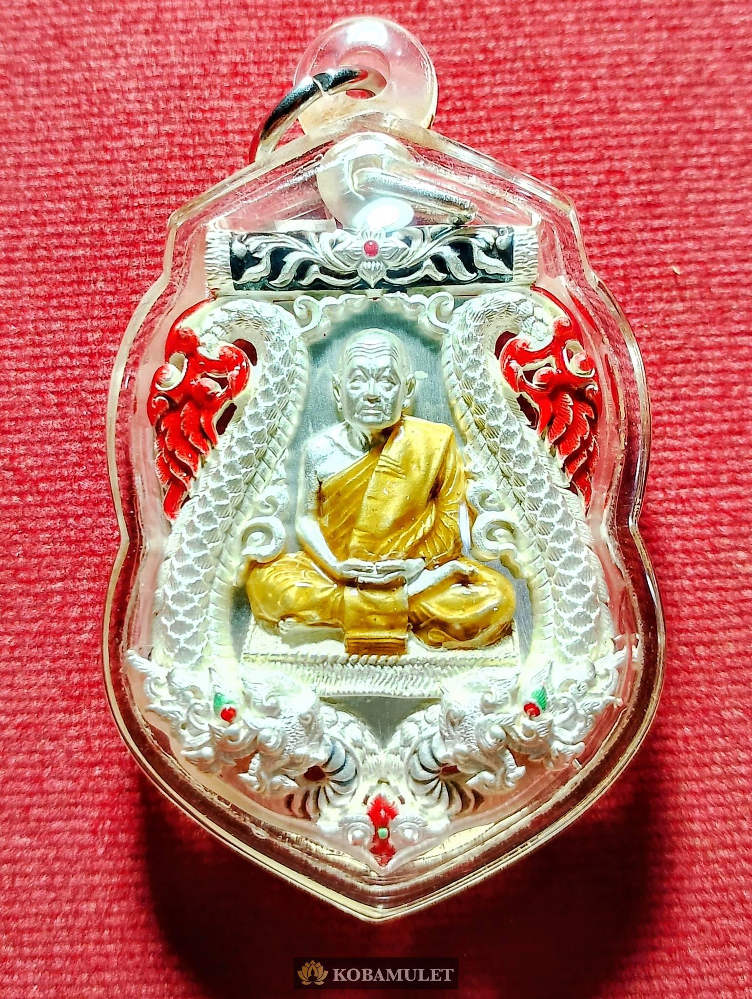 เหรียญฉลุ ๓ ชิ้น นำโชค หลวงปู่บุญหนา ธมฺมทินฺโน เนื้อเงินลงยาราชาวดีแดงน้ำเงินตะกรุดทองคำ หมายเลข ๑