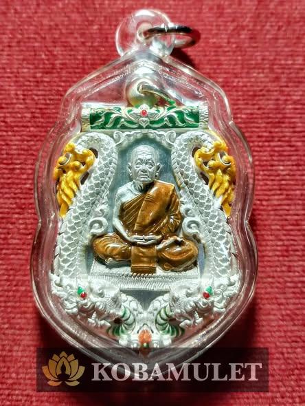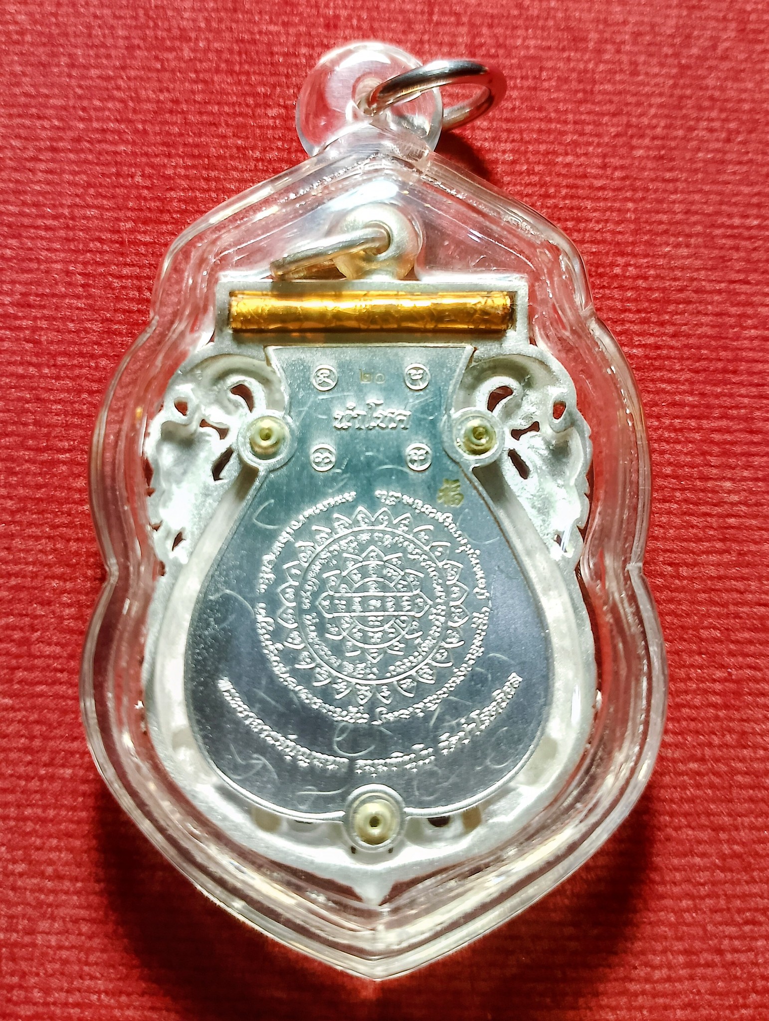 เหรียญนำโชค ฉลุ ๓ ชิ้น หลวงปู่บุญหนา ธมฺมทินฺโน เนื้อเงินลงยาราชาวดี เหลือง หมายเลข ๒๐ เลี่ยมพร้อมจาร
