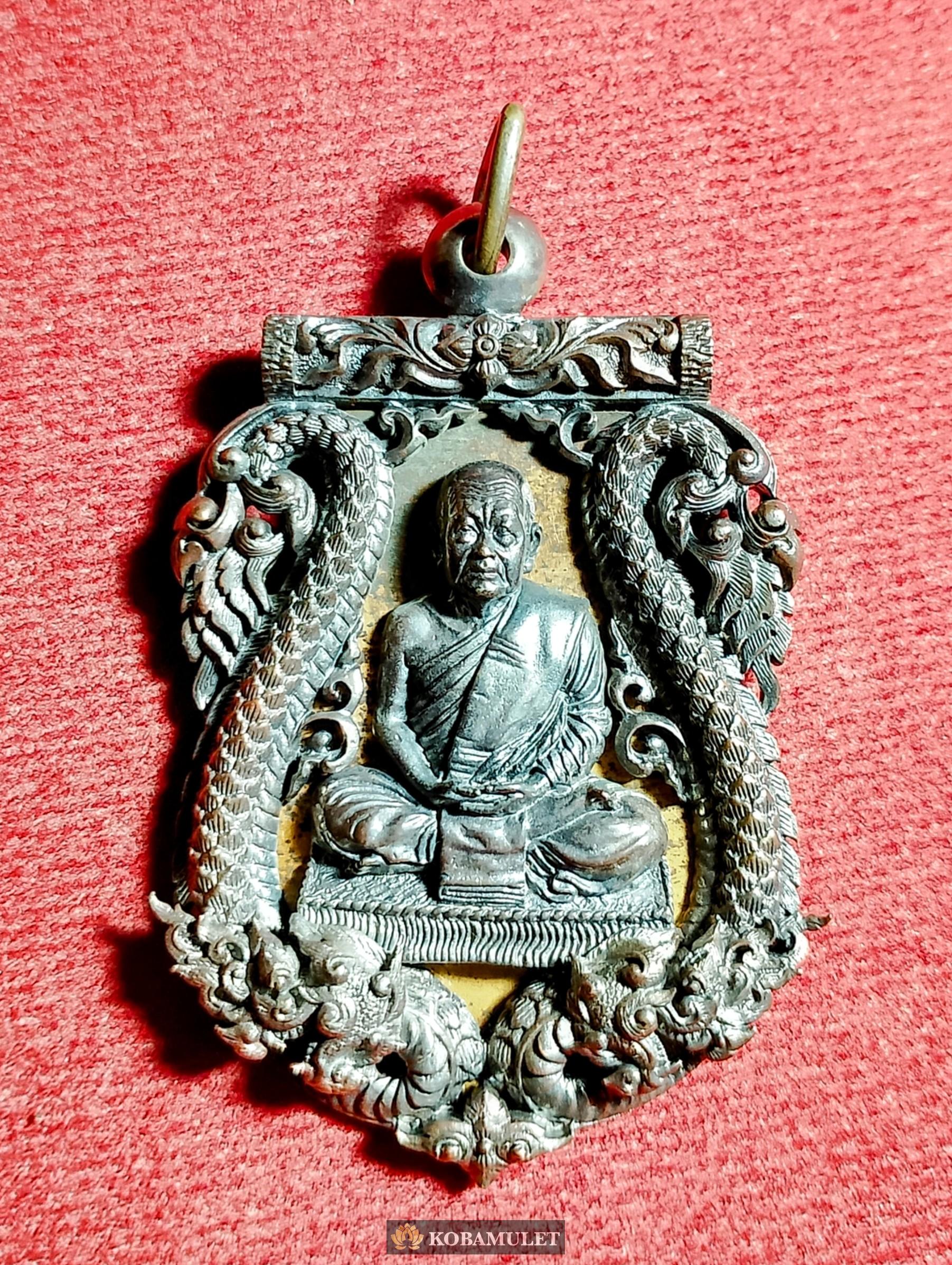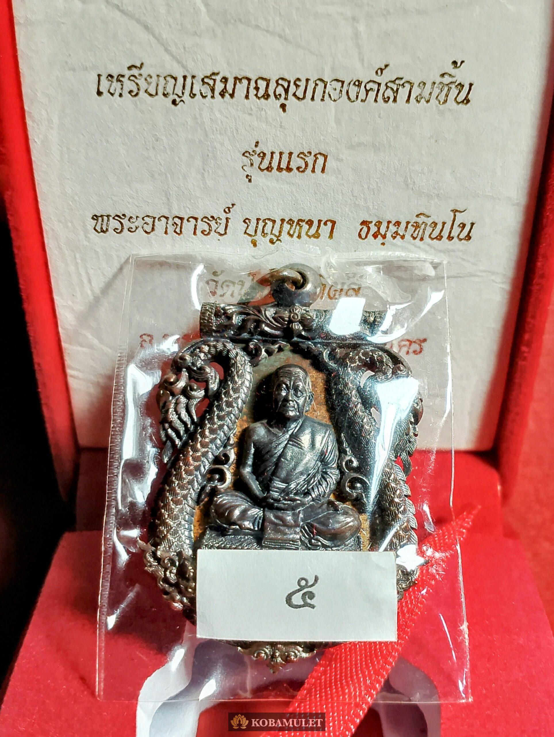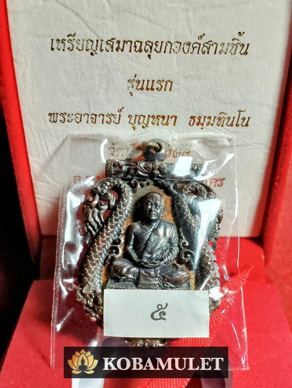 เหรียญเสมาฉลุองค์สามชิ้น รุ่นแรก หลวงปู่บุญหนา ธมฺมทินฺโน ตะกรุดทองคำ หมายเลข ๕